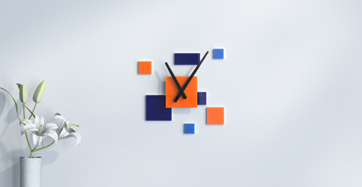 Silent small kitchen deco wall clock - 30 cm - orange, dark blue and sky blue. Customize your silent small kitchen deco wall clock by selecting the desired color for each part listed above.